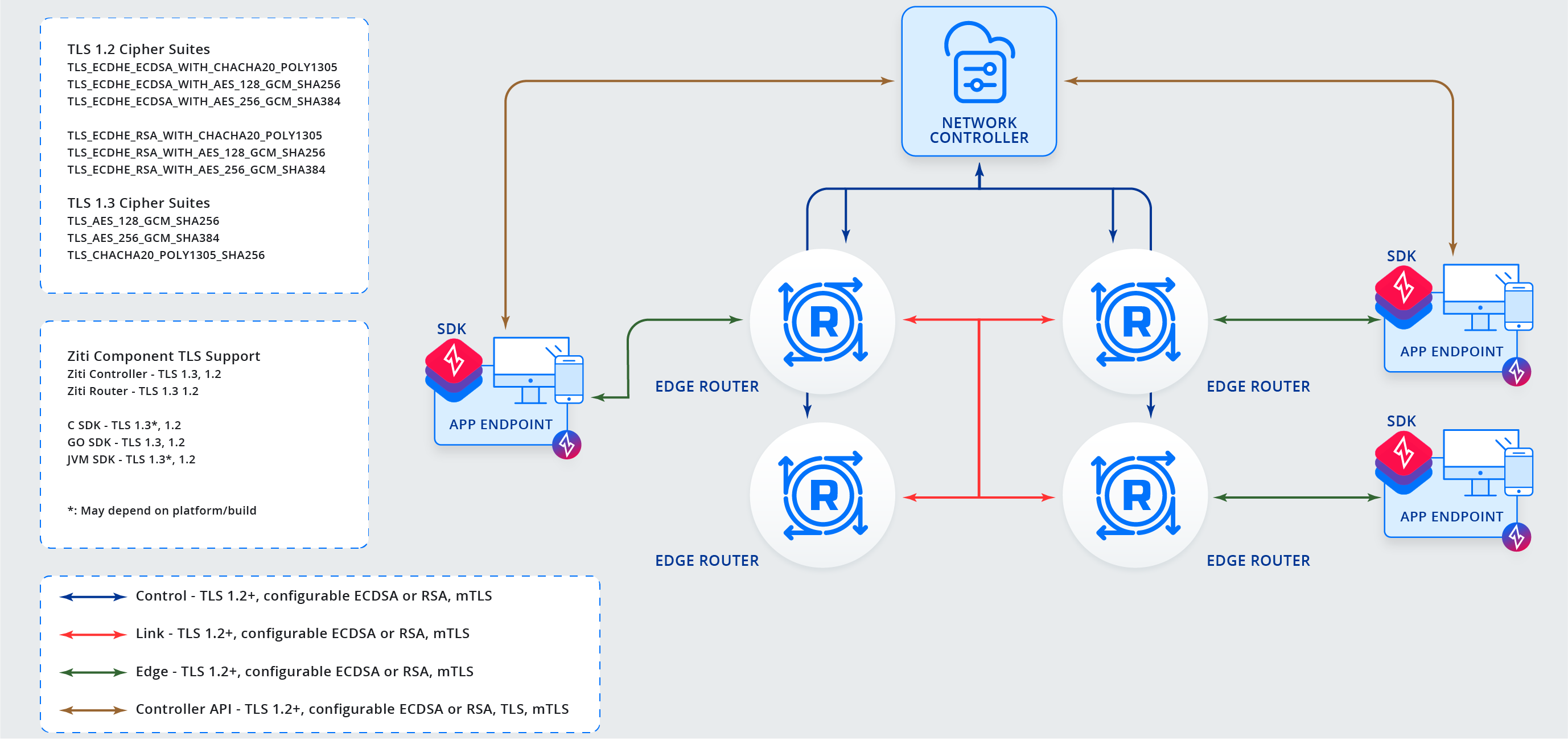 • edge - multiplexed connections between an SDK and an Edge Router that carries service connections. Secured via mTLS 1.2+